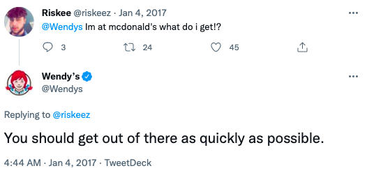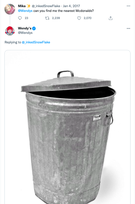 比如快餐品牌Wendy’s已经将logo上这个梳着双马尾、满脸雀斑的红头发小姑娘变成了一个著名的“毒舌派”。与强调好吃、好玩或者快乐生活的其他快餐品牌不同,Wendy’s在社交媒体(尤其是Twitter上)以用毒舌地方式快速响应竞争对手的广告和营销著称。