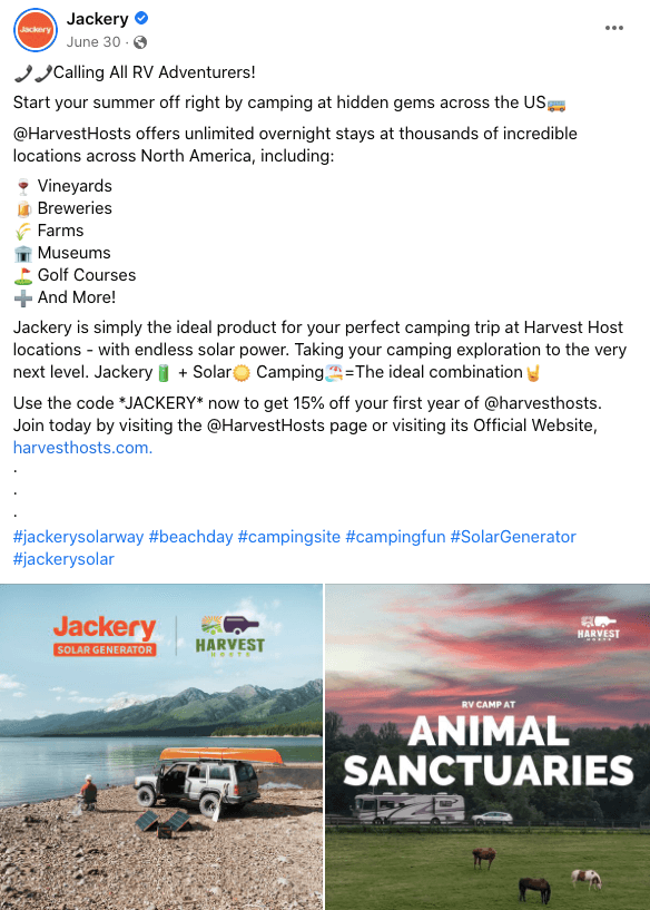 比如户外储能品牌Jackery就在其Facebook全球主页上宣布与房车会员服务公司HarvestHosts合作推出了联动优惠,只要在HarvestHosts注册时使用*JACKERY*代码即可享受15%的首年优惠。