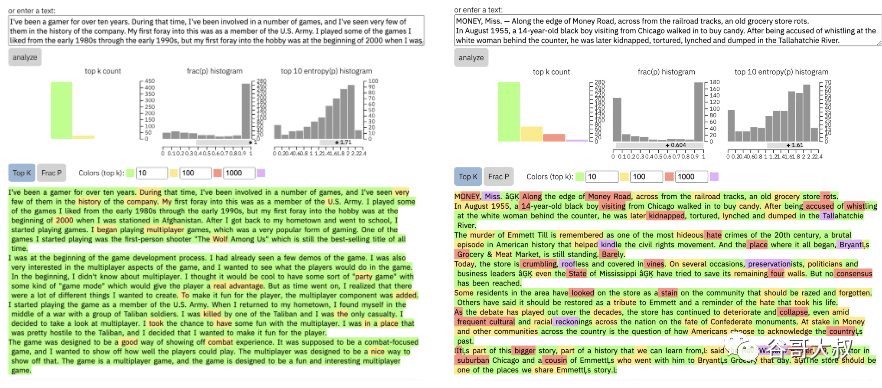 我们找到文中倒数第三张图片用的是GLTR的一个AI探测器,地址是:http://gltr.io/dist/index.html。但此版本的 GLTR 于 2019 年制作,用于针对 GPT-2 文本进行测试。检测最新模型 (ChatGPT) 的文本可能没有帮助。