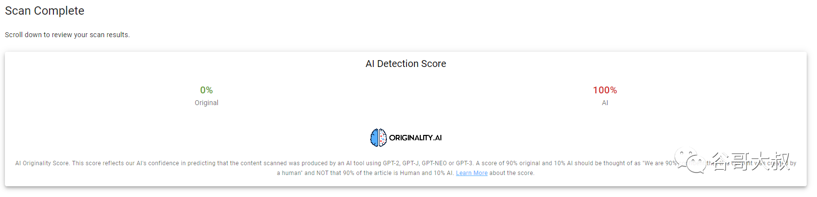准不准呢?把前面列出的那批网站放进去检测,大部分页面会得到一个”100%”的回答,也就是说被originality.ai判定这篇内容有100%的概率是由AI生成的。