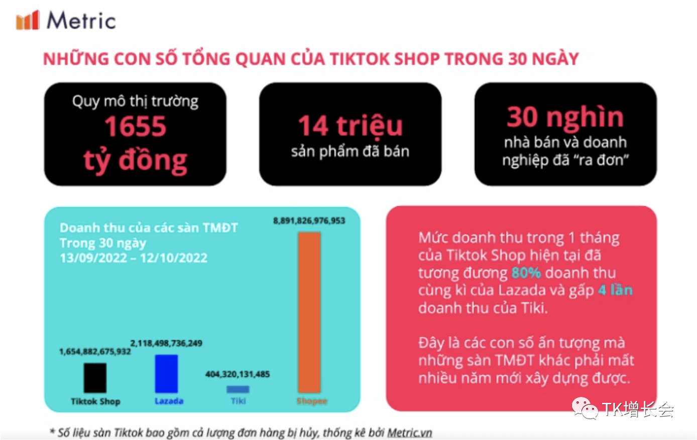 TikTok越南小店去年9月-10月,1个月时间销售16550亿越南盾(约7000万美金),共卖出1400万件商品,平台卖家超过3万。