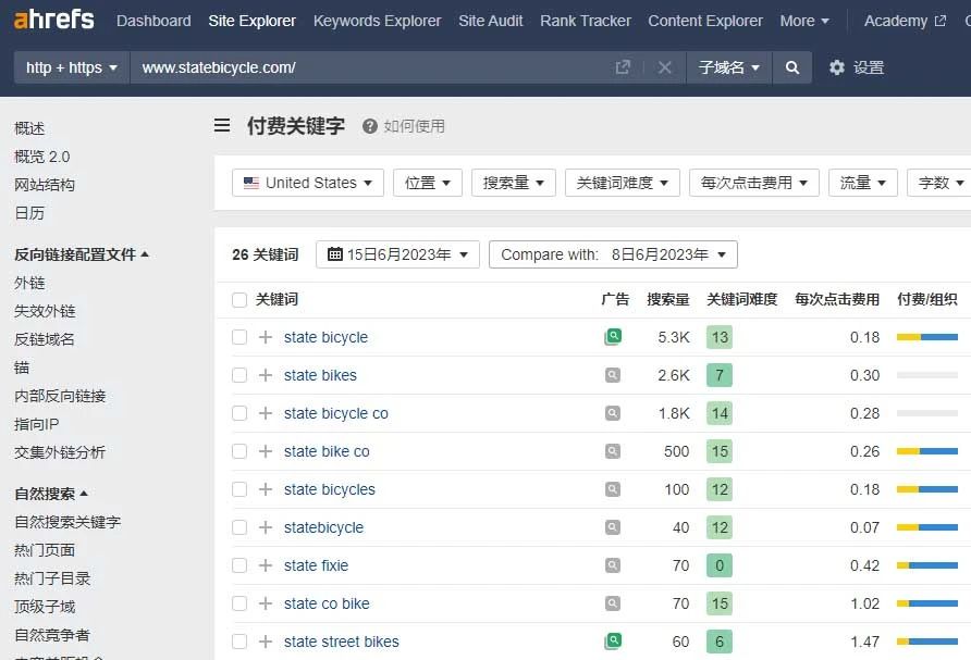 根据ahrefs分析结果显示,State Bicycle Co的付费广告关键词基本上是与品牌相关的,所以整体难度较低,成本也较低。 不过要注意的是,该策略并不适用于新手卖家,因为新兴品牌大多知名度较低,搜索量也较小,品牌词所能带来的流量是非常有限的。