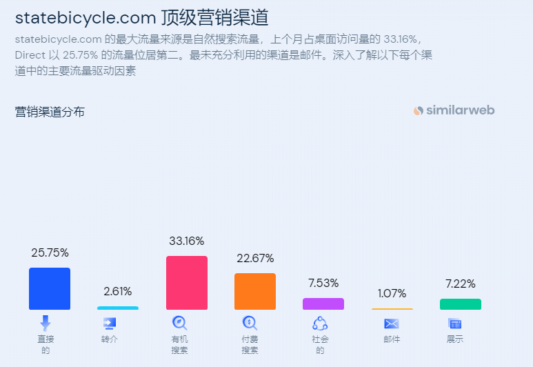 State Bicycle Co官网的流量主要来自于直接访问流量(25.75)、自然搜索流量(33.16%)、付费搜索(22.67%)、社交媒体(7.53%)。