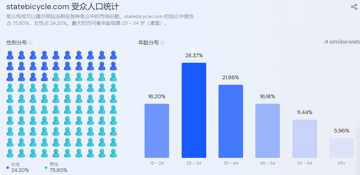 根据similarweb数据显示,State Bicycle Co官网男性用户占比高达75.80%,女性用户占比则只有24.2%,年龄分布主要集中在25岁到44岁之间,这就印证了我们前面的这一猜测。