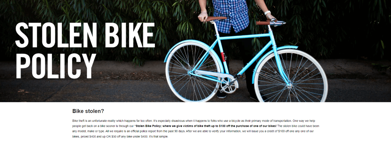 为减轻消费者因盗车所带来的损失,State Bicycle Co推出了被盗补贴活动,消费者只需要提供报案记录,即可获得100或50美元的优惠券。这一活动,不仅能够提升消费者好感度,还能带来二次复购,进而提升消费者忠诚度。