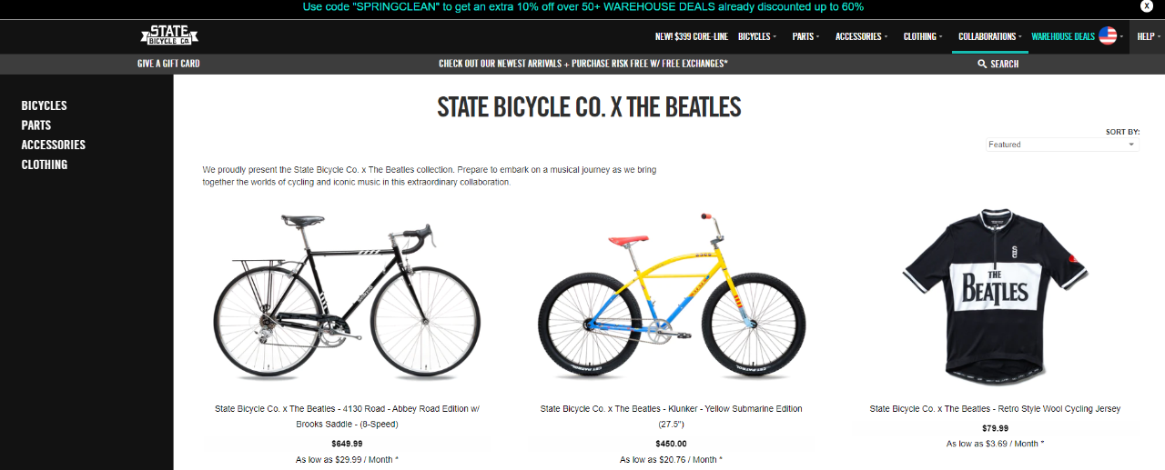 State Bicycle Co与披头士乐队、WU-TANG CLAN等知名乐队展开合作,推出联名款自行车、骑行衣、配套装备等,是能够促使相关爱好者为其买单的。