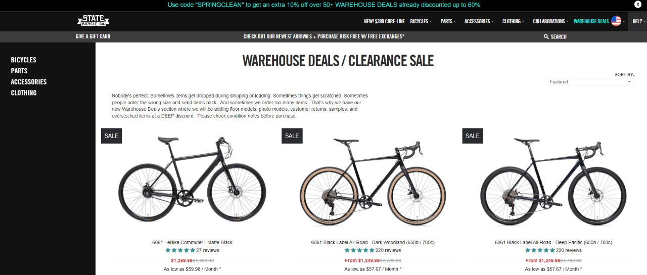对于消费者来说,绝大多数营销都不如大额折扣来得有吸引力,因为消费者是能够从中直接获利的。State Bicycle Co推出的清仓折扣活动,明确表示是库存或瑕疵产品,但承诺会给到消费者超高折扣。