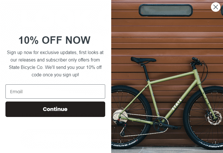 注册优惠弹窗,一方面能够在最大程度上吸引消费者的注意力,另一方面实在的折扣也能促使新客下单。State Bicycle Co的注册弹窗是在进入网站后立即弹出的,这能够促使每一个进入网站的访客,都在第一时间注意到该弹窗。