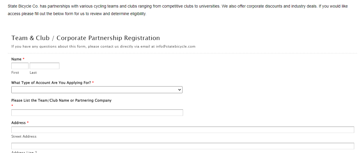 与特殊团体进行合作,既能扩大品牌知名度,也能大规模地接触到潜在精准客户。State Bicycle Co给到与其合作的竞技俱乐部、大学、车队专属折扣,不仅能够有效提升销量,也能提升特定群体对其的好感度。