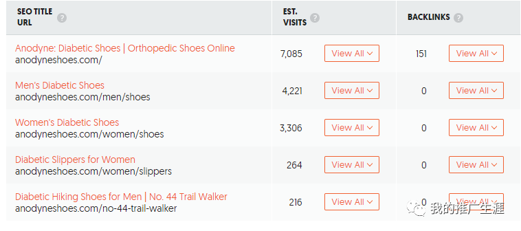 这个网站也是主要通过网站品牌词和产品分类页面去获取流量的,可以看到最主要的三个页面获得绝大部分的流量,这个也是很多细分网站的现状,基本上1-3个网页获得了绝大部分的流量,其他的页面获得了比较少的流量。