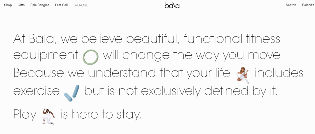 官网的一段话诠释了其品牌信念:在 Bala,我们相信漂亮、实用的健身器材将改变您的运动方式,因为我们知道您的生活包括运动,但不完全由运动来定义,玩乐在这里得到了延续。