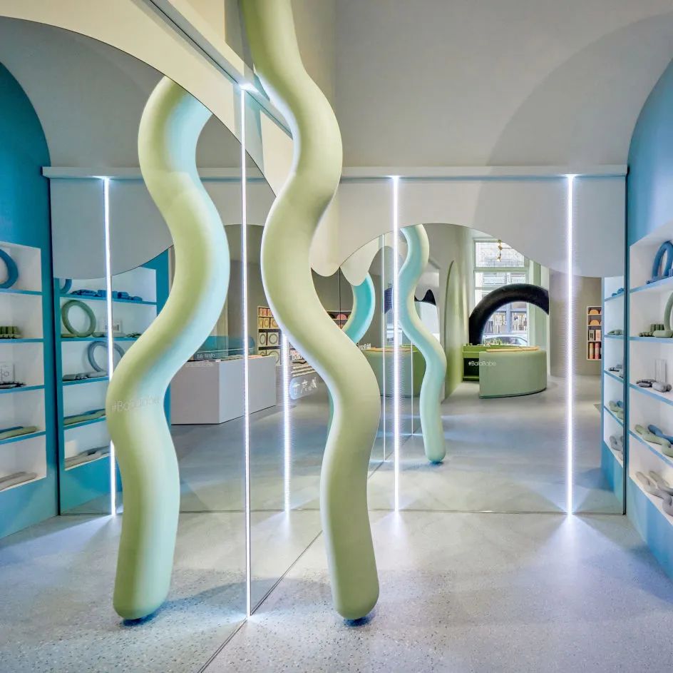 该空间将消费者与产品本身联系了起来,游客仿佛置身在“巨人国”中,负重手环和哑铃环等产品在这里得到了放大。色彩上的组织、独特的分区使游客沉浸在每一块色域中,提高了消费者的临场感,加深了品牌印象。
