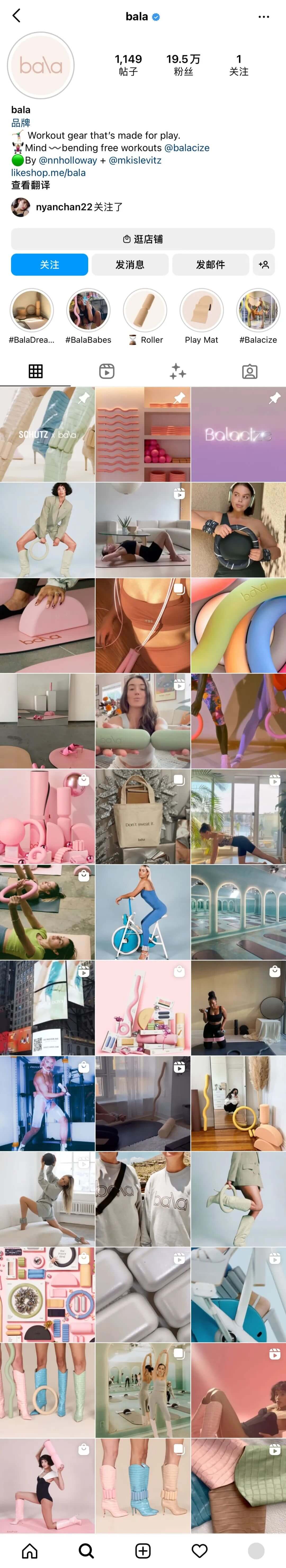 Bala 对品牌一致性的执着同样体现在 Instagram 上。在这里,用户感受到的运动氛围是轻松且无束缚的,在饱览视觉盛宴的同时,还有机会随机成为 Bala Babes,将健身体验分享给大家。