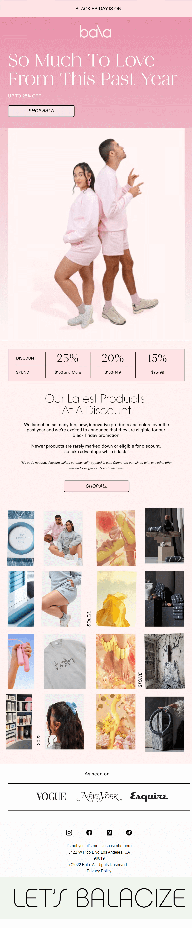 在自有营销上,Bala 则是活用了电子邮件作为产品推广的主阵地,推动转化的同时还能将品牌符号再次印入受众的记忆中。
