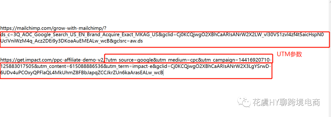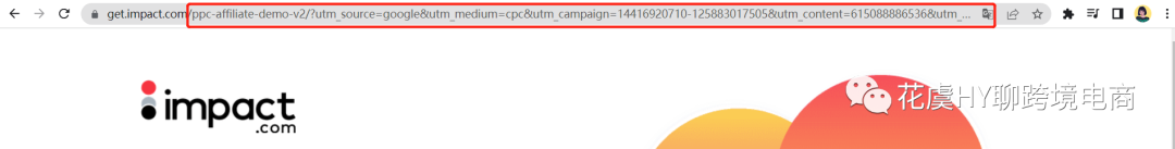举个例子:在搜索引擎中搜索mailchimp以及impact后点击广告关键词进入的页面,你可以看到虽然也是官网或者正常的落地页,但是URL后面跟着一大串东西,这个就是UTM链接,后面这一大串就是Parameters,我们自定义的参数。