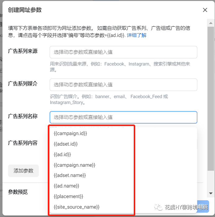 (动态参数的意思就是FB系统会根据你设置的动态参数自动填充相对应的数据进去以多方面收集不同版位、广告系列、广告组等数据)