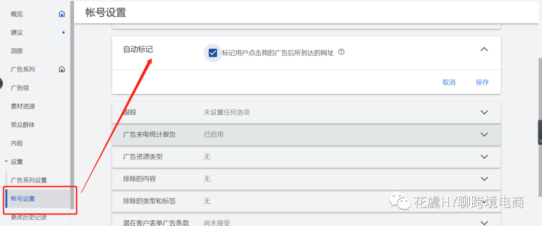 我们打开谷歌广告后台-设置-账号设置-打开自动标记,那么gclid参数就会自动的添加到最终到达页面的网址当中,免去了手动操作的麻烦。