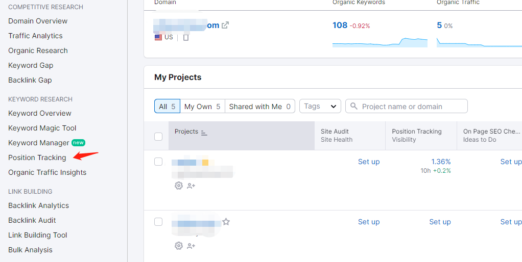 至于具体的排名监控方法,我一般使用数据分析工具。像 SEMRUSH 上可以使用”Position Tracking”功能,来追踪网站的整体关键词排名情况,也可以追踪整体的数据变化趋势。