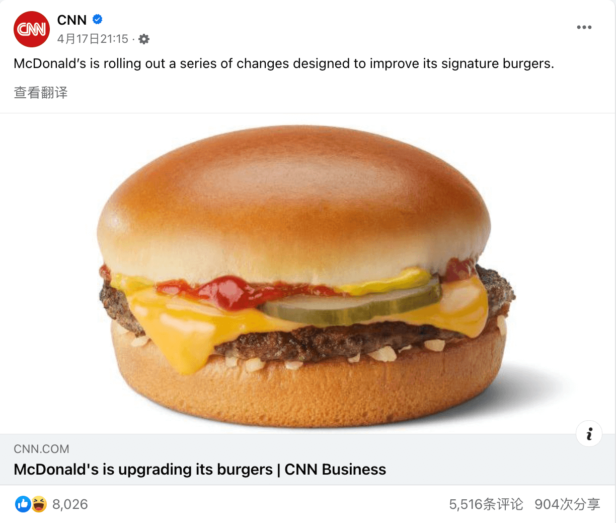 CNN在其Facebook主页上发布了一条帖文,内容是关于麦当劳推出一系列改变,旨在改善其招牌汉堡的报道: