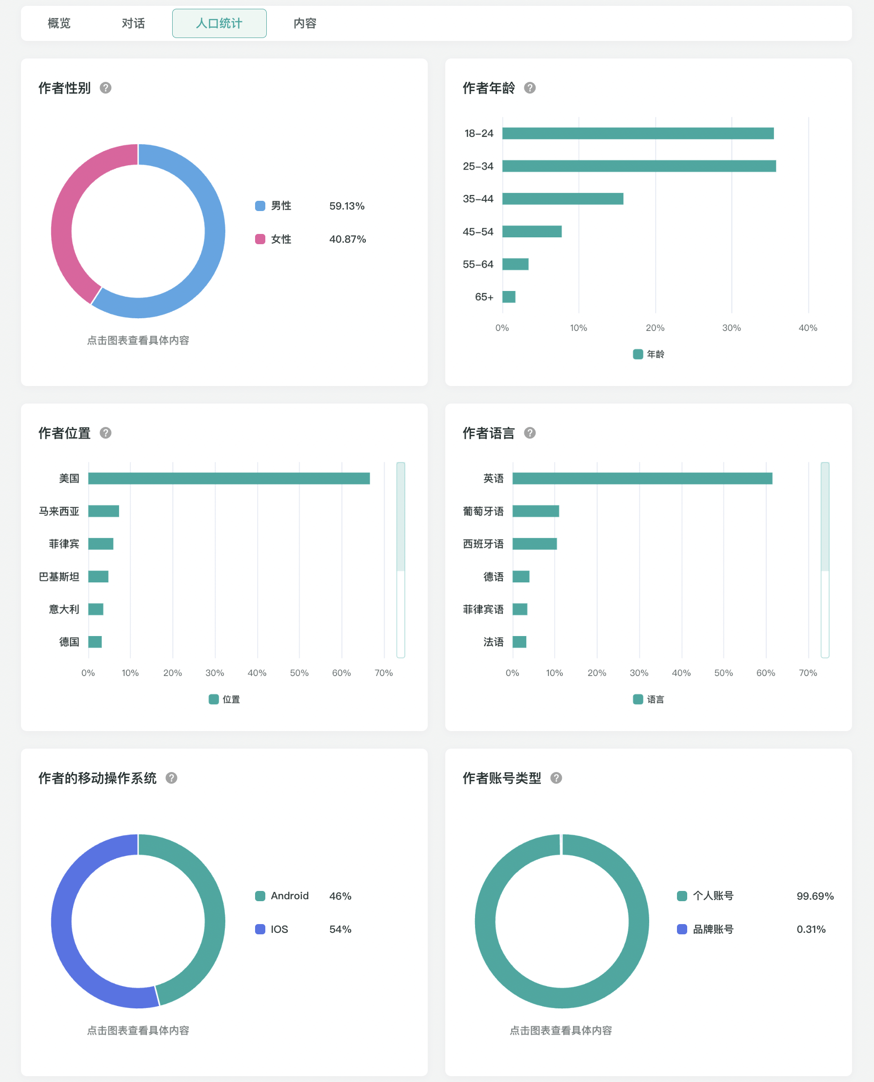 通过人口统计,可以帮助出海品牌发现每个声音背后的真正影响者,充分了解他们的年龄、性别、国家、城市和语言等等: