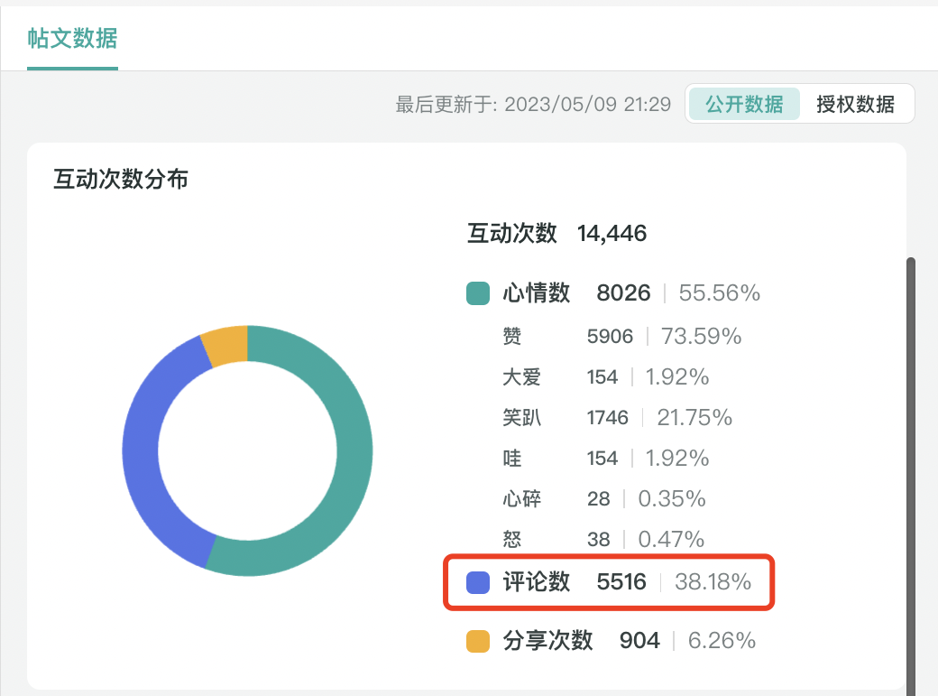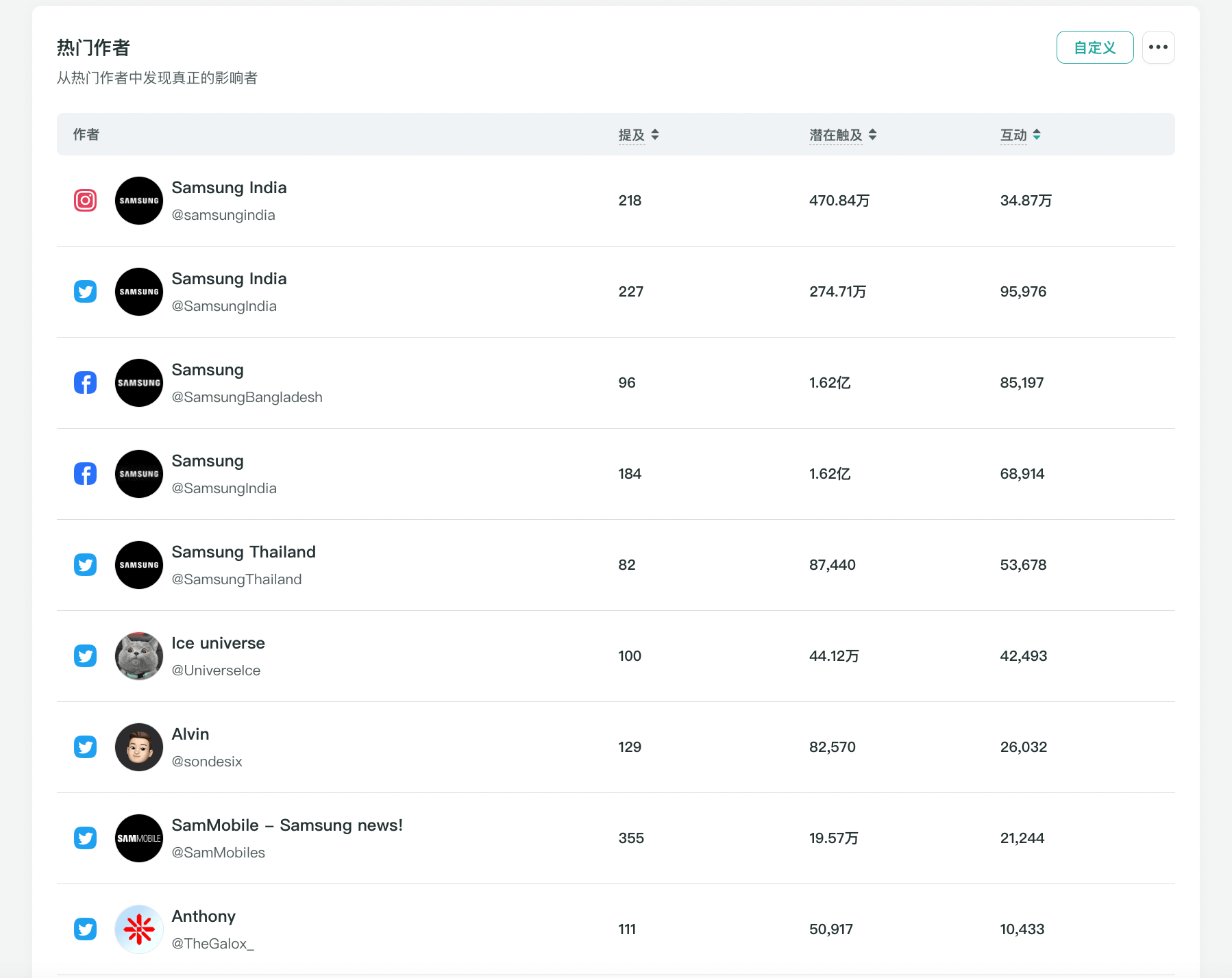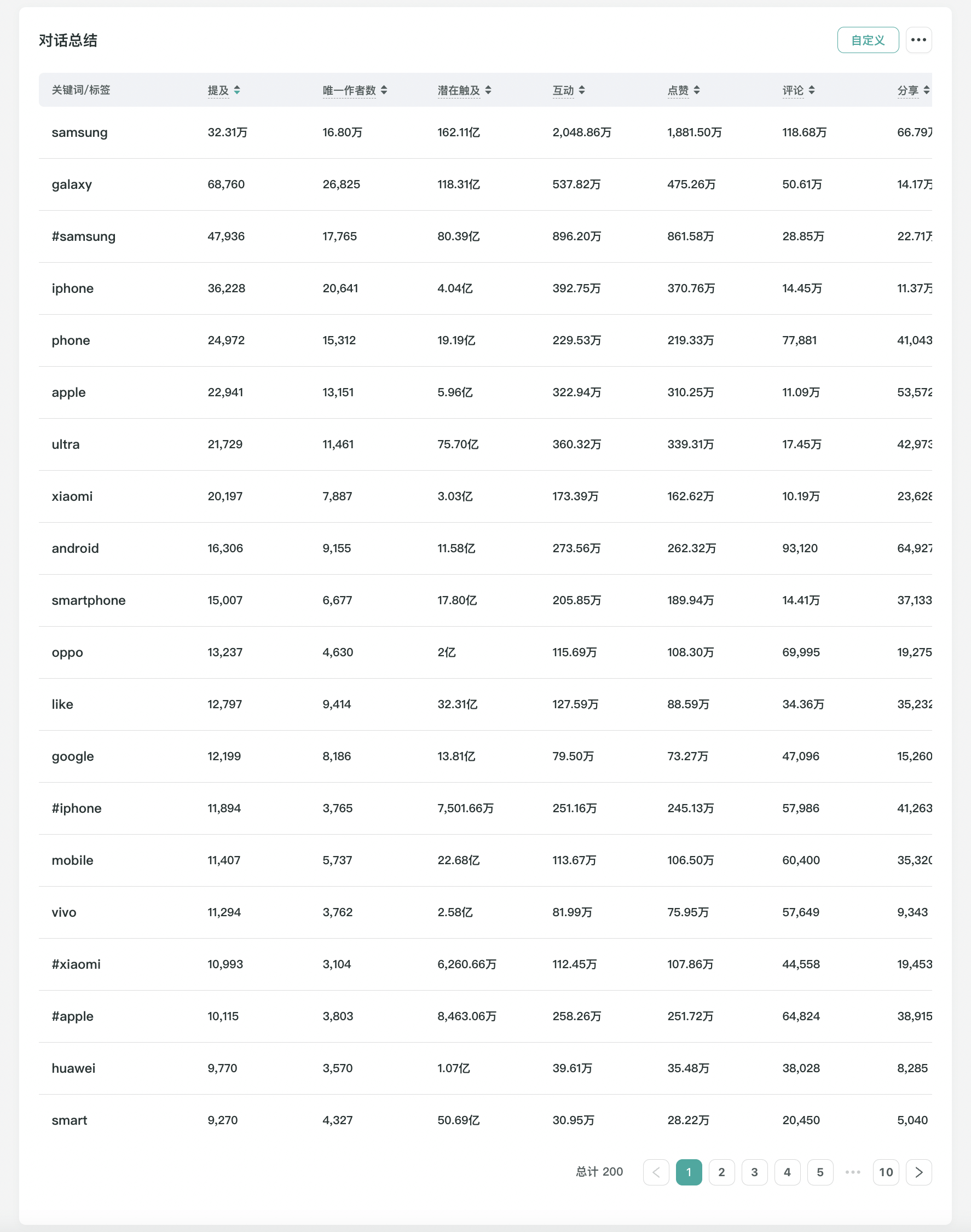 对话中的不同关键词/标签的提及数、唯一作者数、潜在触及数、互动、点赞、评论、分享、积极提及数、消极提及数等数据在“对话总结”中以列表形式进行展现: