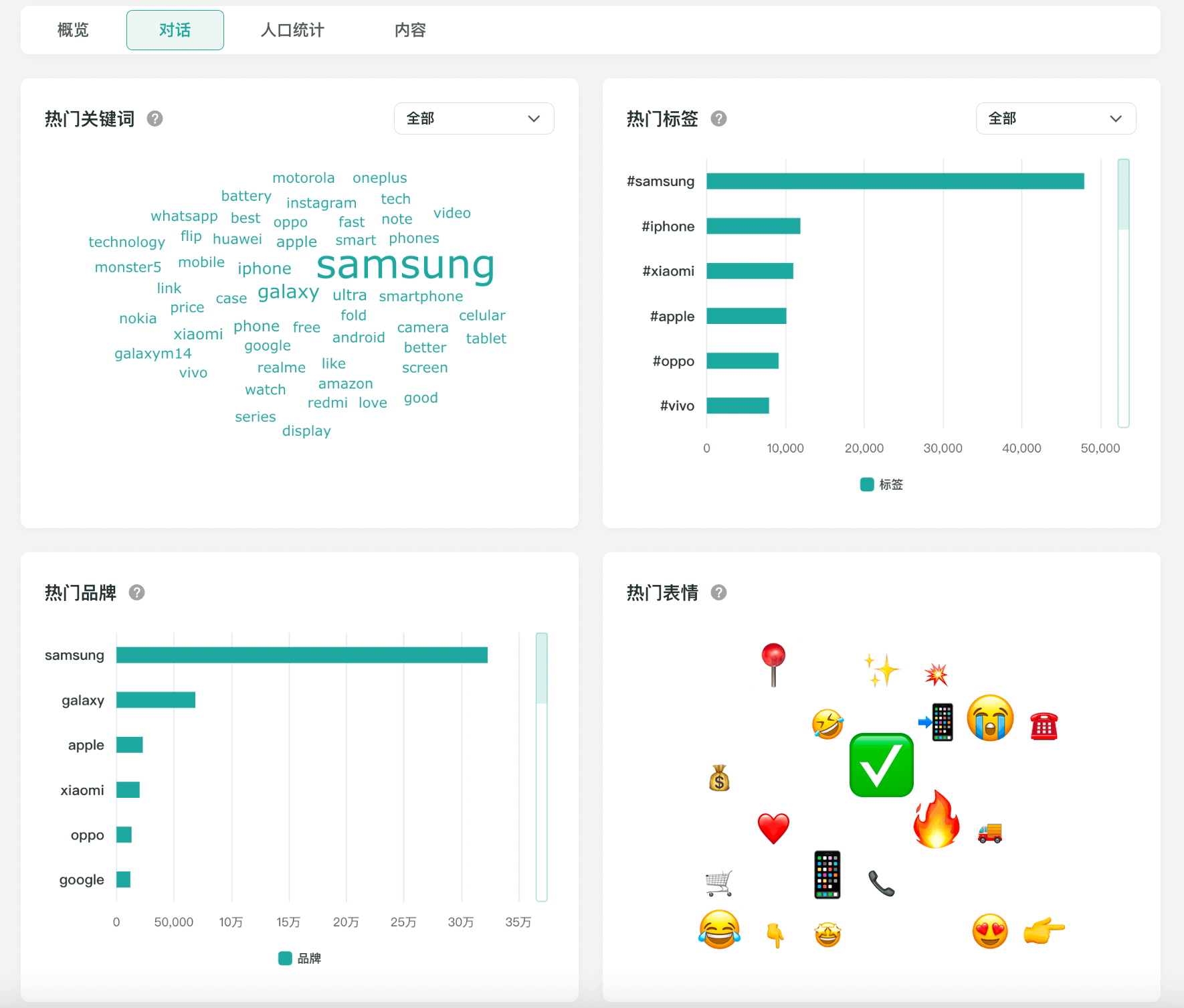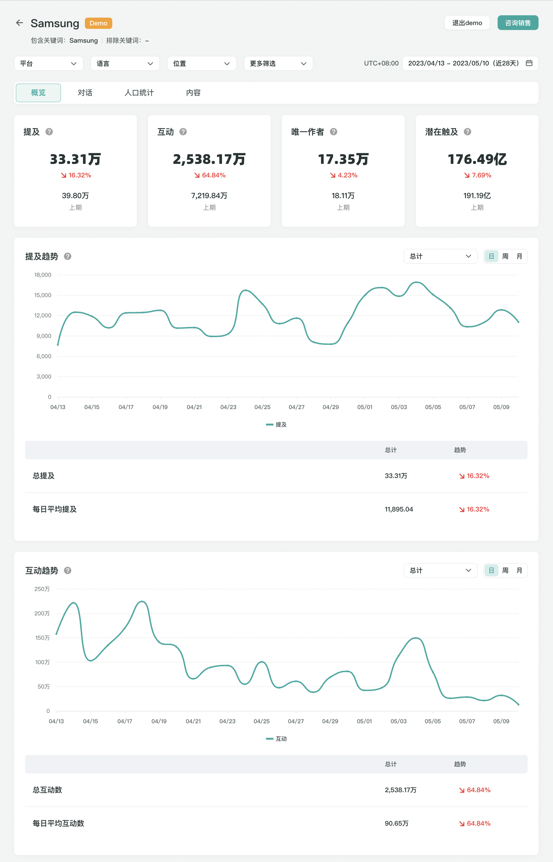 所展示的DEMO显示社交聆听分为四部分内容,分别为概览、对话、人口统计、内容。