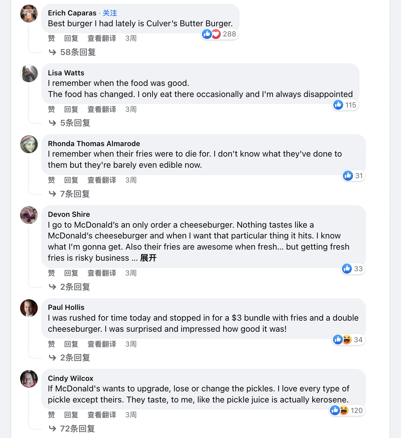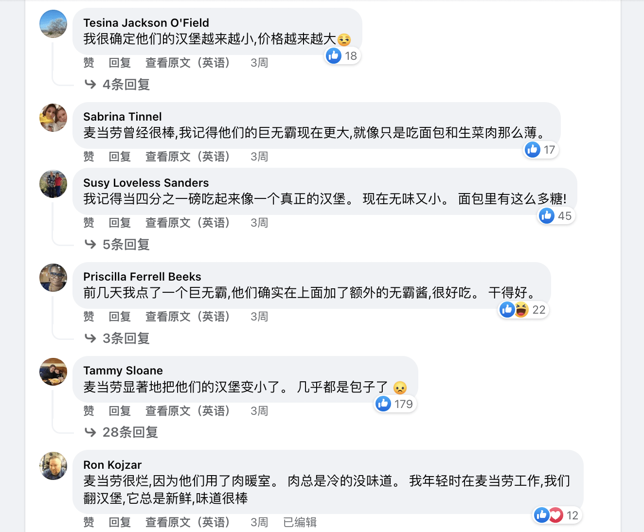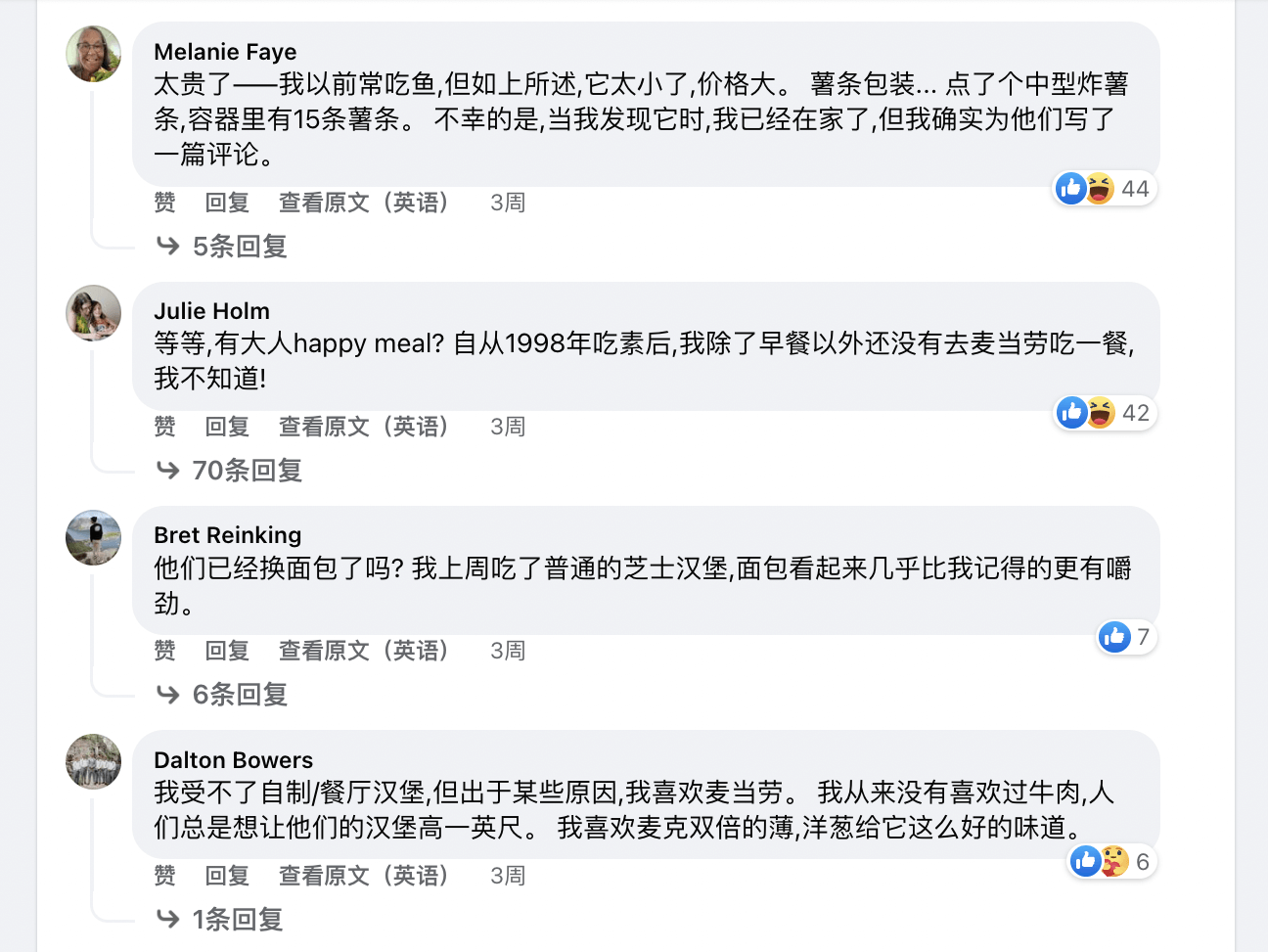 评论中有夸赞,然而对麦当劳用料多少、价格贵贱的吐槽也不少,有人甚至在不悦的购餐体验后专门写了一篇评论文章,以下是该帖文下的部分评论内容(经由Facebook翻译):