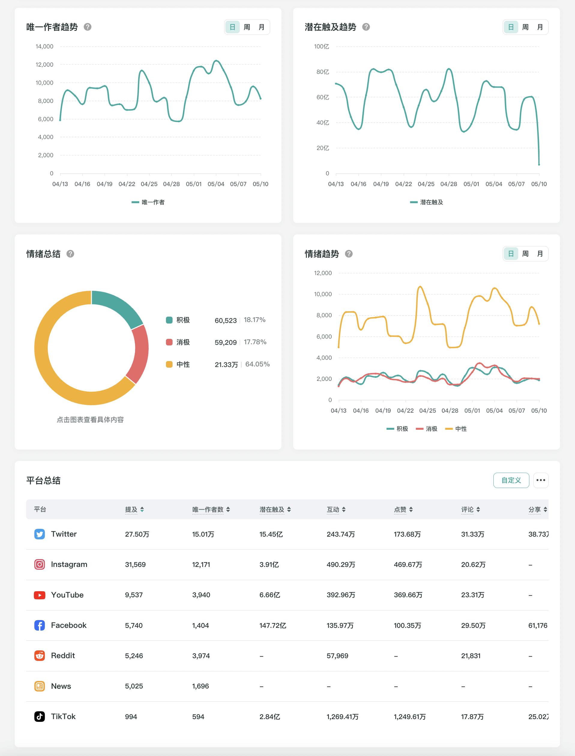 其中,概览部分涉及到了提及、互动、唯一作者、潜在触及、情绪等相关数据统计及分属于各平台的数据汇总,更可分钟级监测品牌在社交媒体上的提及趋势、互动趋势、潜在触及趋势: