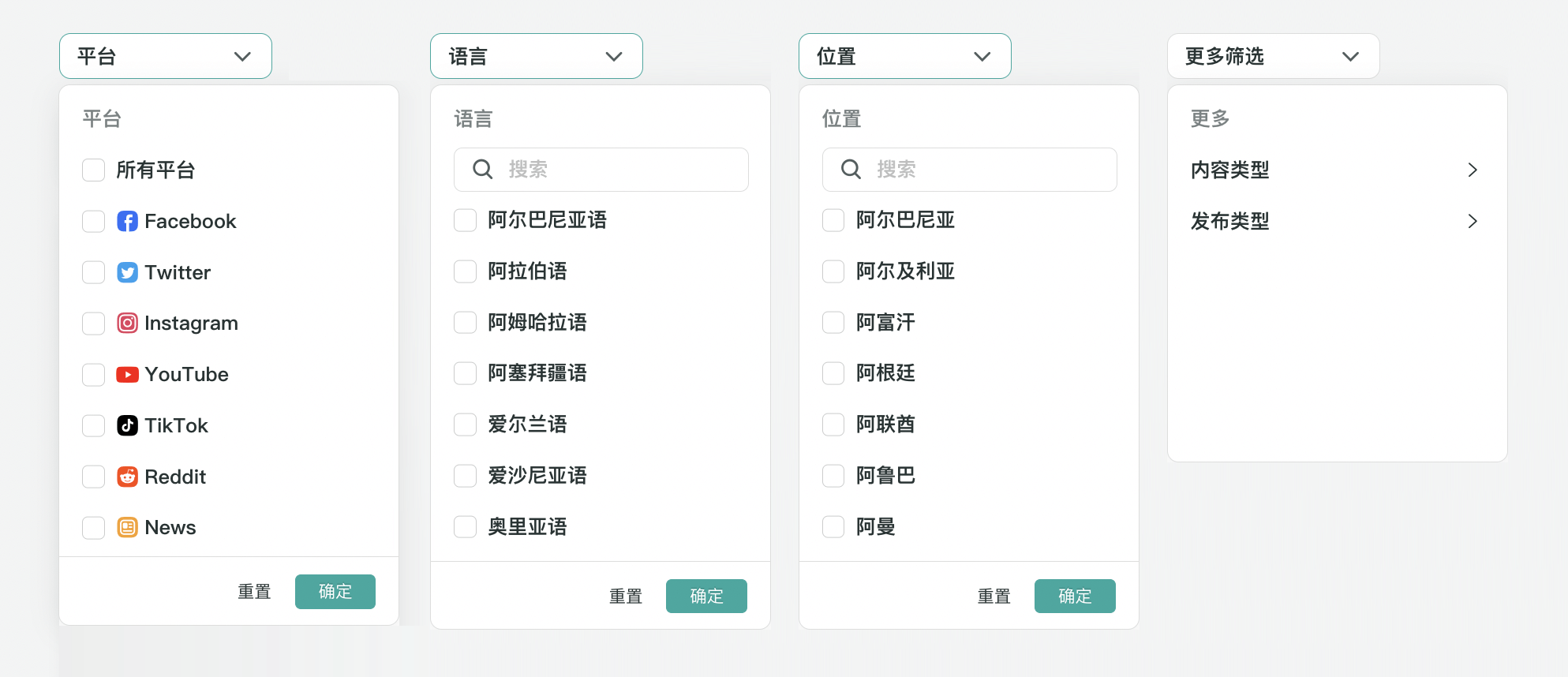 出海品牌可以根据自身需要从海外社媒平台、所使用的语言、所处的国家和地区、内容类型和发布类型等不同维度筛选你所需要的数据内容: