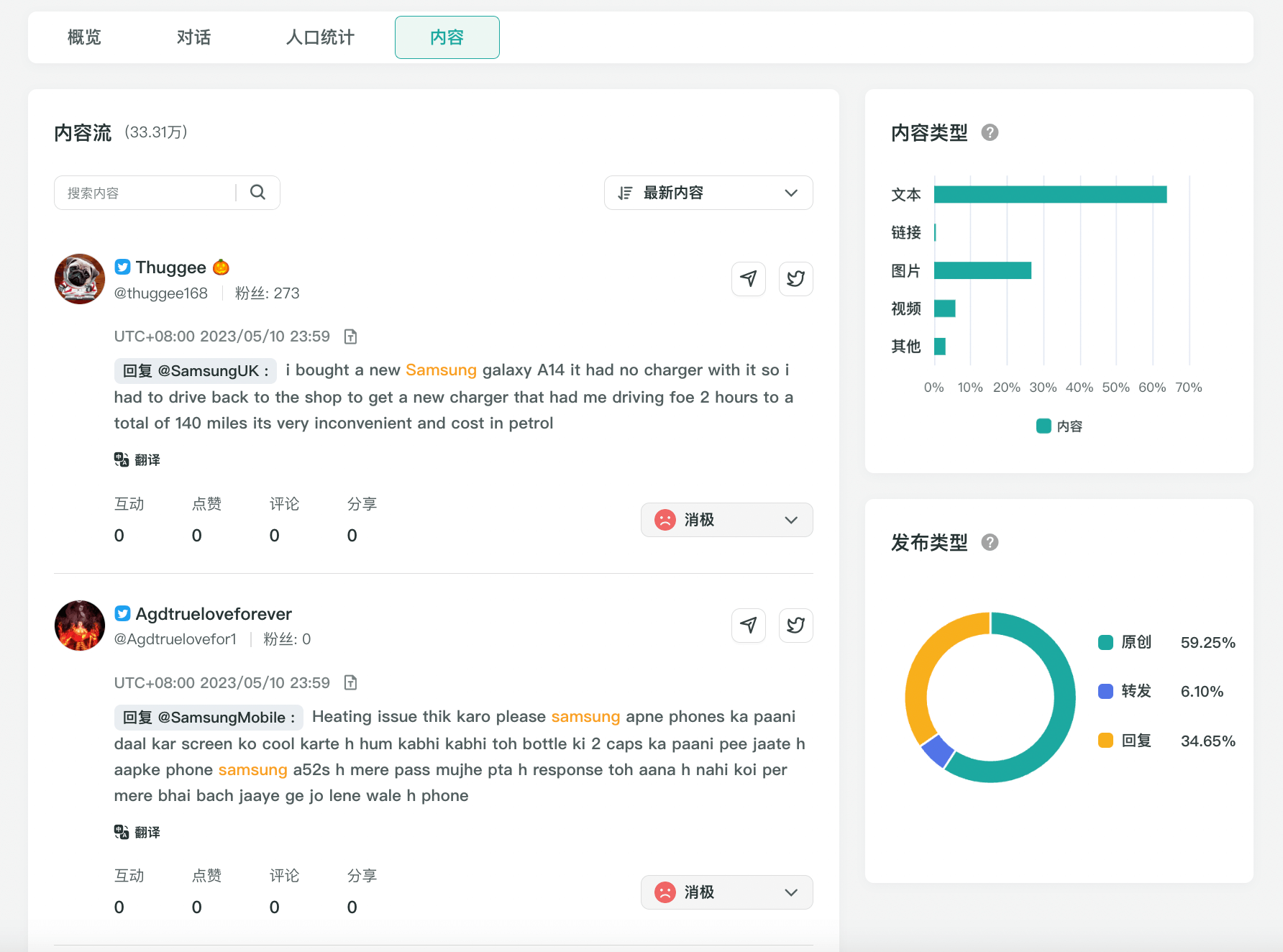 内容部分,基于人工智能的实时内容分析自动区分了内容的情绪是积极、消极还是中性,并展示内容类型和发布类型的占比统计: