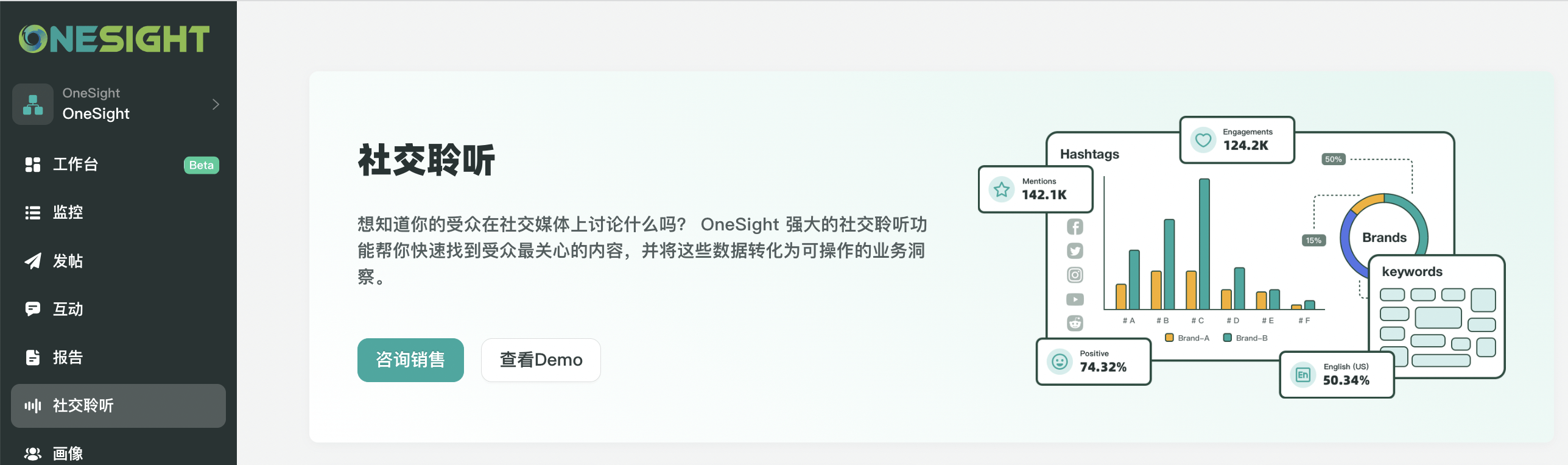 OneSight作为全球社交媒体数据营销管理平台,产品功能涵盖了大部分中国品牌的出海营销需求,其中包括社交聆听。登录OneSight营销云后进入“社交聆听”模块,可以查看社交聆听功能的DEMO: