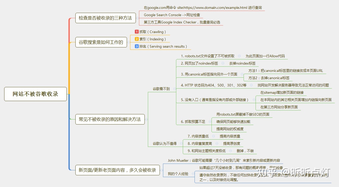 这是一个相对比较大的话题,有兴趣的可以看我另外一篇专门讲如何解决页面不被谷歌收录的文章。如果上面提到的技术SEO知识点你已经掌握得比较好了,直接看下面这张整理了要点的思维图: