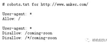 解读过来就是:Anker允许所有搜索引擎蜘蛛爬行除了URL中带有/coming-soon以外的网页。