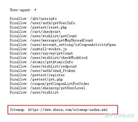 很多网站的robots.txt文件最后一行代码是指向本站的sitemap文件,比如我们来看Shein的robots文件的最后一行代码 https://www.shein.com/robots.txt
