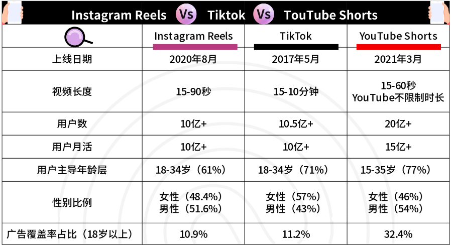从目标受众来看,TikTok拥有更多的女性用户,Instagram近一年来男性用户比例有所上升,甚至超过了女性用户,而YouTube Shorts则更受男性用户青睐。