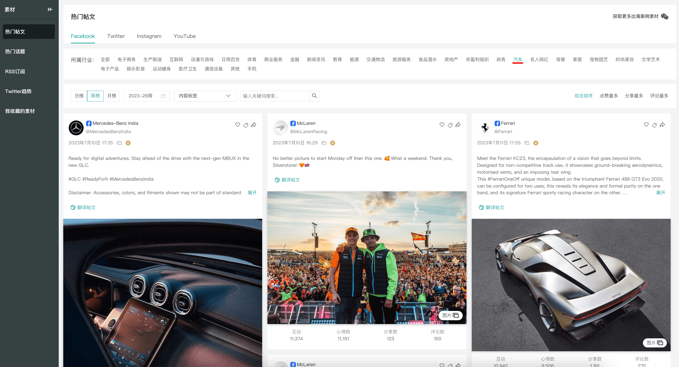 为了做好差异化,出海品牌除了重点关注竞品,往往还要扩大范围,关注到整个行业的内容动态,在OneSight营销云的“素材”模块的“热门帖文”页面,点选所属行业后,可以根据不同维度快速查看本行业的热门帖文内容: