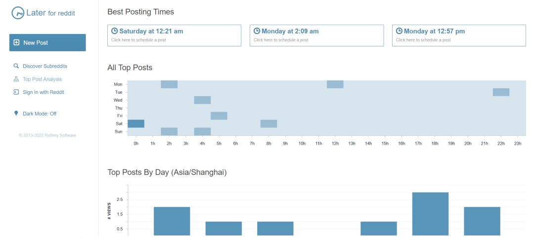 有一个小工具可以帮助大家去查找最佳发帖时间:Reddit Later,地址是https://laterforreddit.com/.