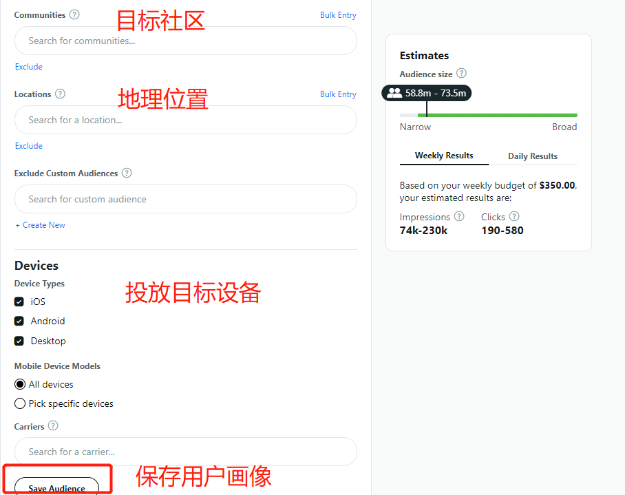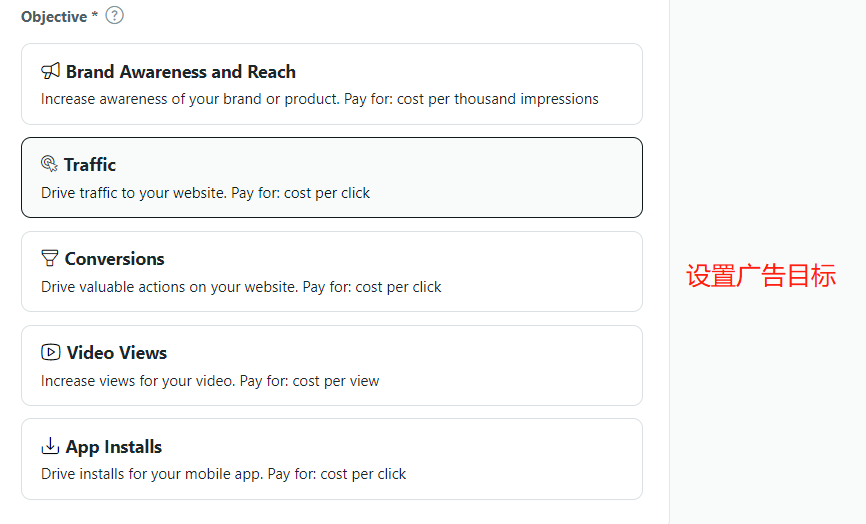 Bid:根据之前选择的投放类型是要下载量还是转化量进行选择,比如我选择的是点击量,系统给的选择就是Per click,这个出价更像是竞价,如果你想要你的广告得到更好的展示,可以选择更高的价位。