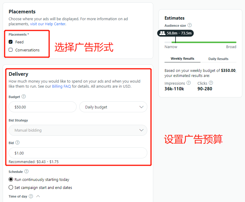 Budget:设置广告费用,可以设置总的广告费用,有Daily budget和lifetime budget两种,按天或者按最高额度设置广告投放金额。