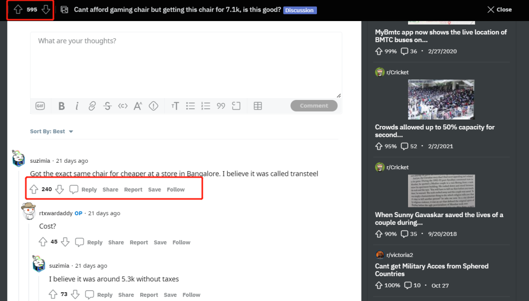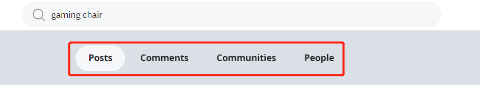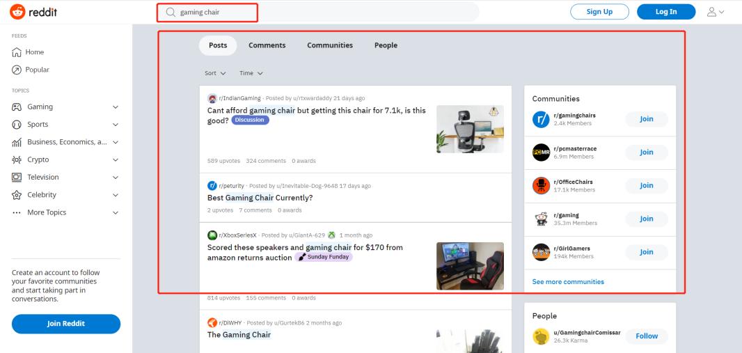 进入主页后可搜索你感兴趣的产品关键词,如下图我搜索了gaming chair后,系统推荐了四种类别,分别是Posts/Comments/Communities/People,可以查看帖子、评论、社区、或寻找好友。