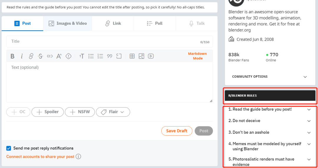在发帖之前,需要留意每个社区的规则,可以在社区界面的右侧查看,你在该社区的发帖、评论等行为都要遵守这个规则。规则设置可以使用人工审核、机器审核自动化、或用户举报或者对该帖子进行“downvote”的方式处理。违反规则的帖子很容易被删,严重的话有可能导致账号被封。