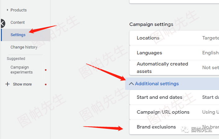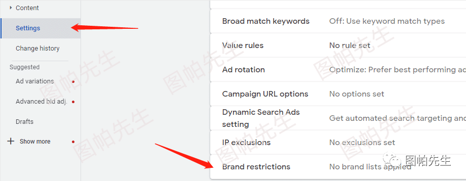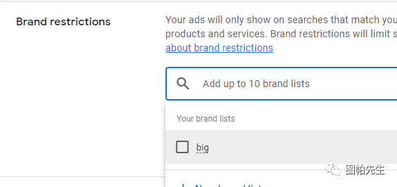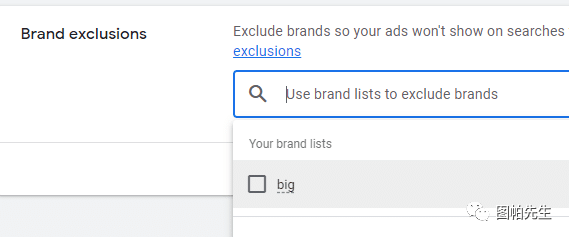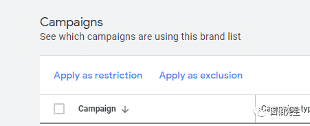 在广告系列的设置的附加设置里面,选择 “品牌排除brand exclusions “