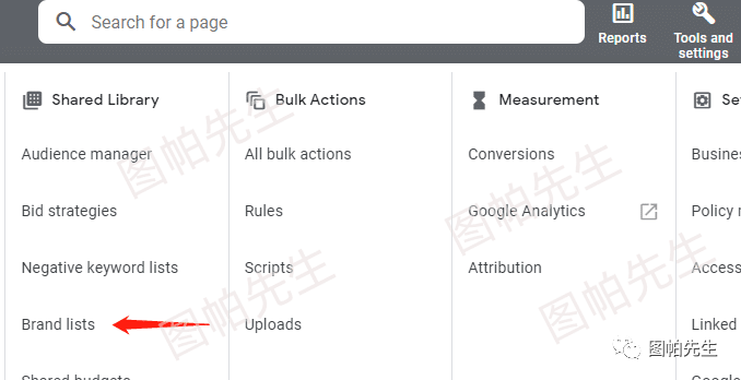 在谷歌广告账号后台点击工具图标的设置,在菜单里选择品牌列表: