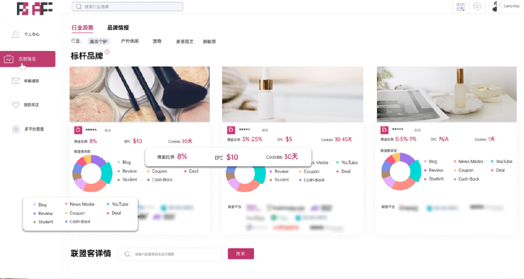 - 看联盟伙伴详情:进一步了解联盟伙伴画像,如国家影响力分布、内容主题偏好、与竞品合作动态及效果