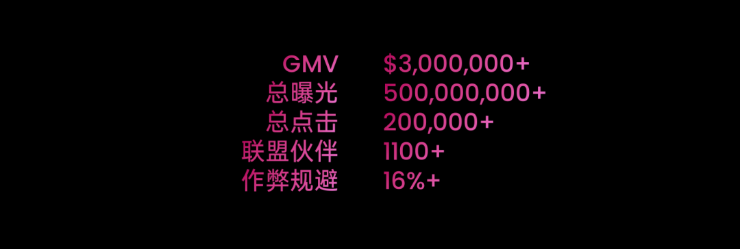 以FOSHO与某部户外垂类用品的合作为例,经历6个月时间,FOSHO整套解决方案助力品牌在美国市场实现超300万美金的GMV增量、超5亿级曝光、超20万点击,合作1100多个联盟伙伴,包括新闻媒体、社媒红人、Shopping、折扣以及B端伙伴等,同时规避16%作弊佣金。