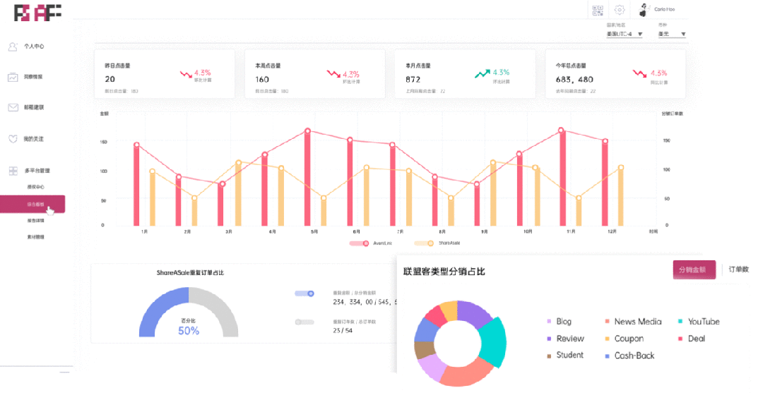 - 集成管理&可视化运营:一键接入FOSHO AFF及不同平台的联盟伙伴,实现多个平台的数据管理,自动生成联盟运作报表,全渠道经营情况可视化
