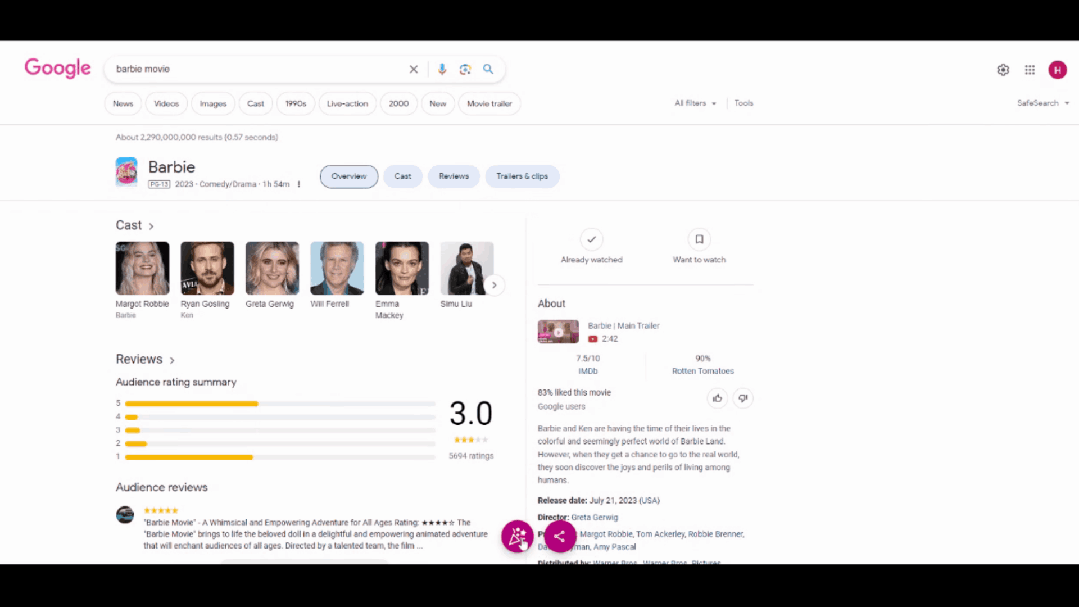 此外,Barbie的视觉元素也被运用在线上传播,比如当我们在Google搜索 Barbie/Barbie Movie的时候,就会看见以下的画面: