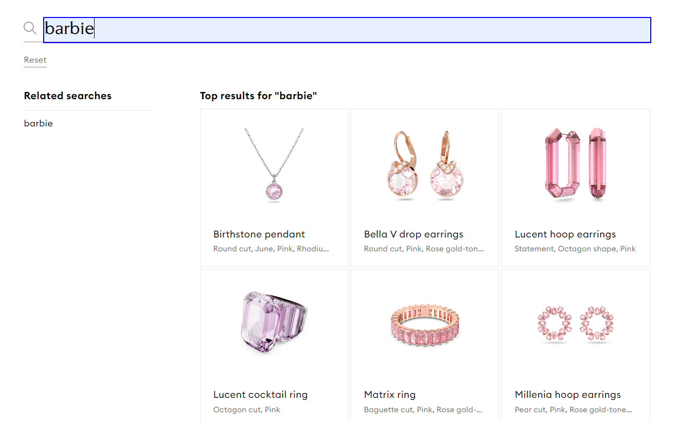即使是没有Barbie官方授权的大品牌也在利用粉红色主题的趋势。施华洛世奇位于纽约市 Soho 的店在它霓虹粉红天鹅标志后面装饰了粉红色的墙壁,在施华洛世奇的网站上搜索“Barbie” 也会显示玫瑰金珠宝和粉红色宝石戒指的搜索结果。