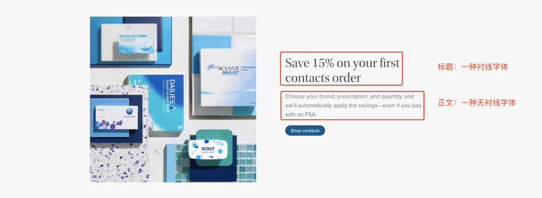 如图,Warby Parker就是在标题中选择了衬线字体而正文使用了无衬线字体,这样既能利用不同种类的字体形成对比,也保证了易读性。