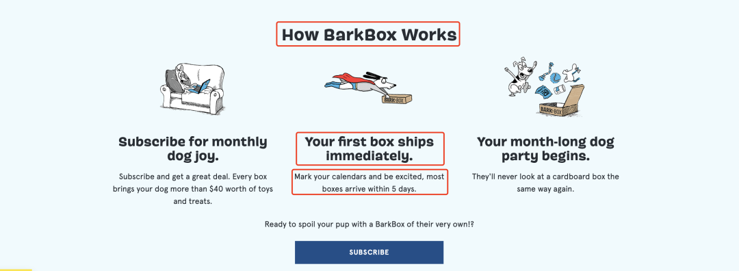 为了让不同粗细的字体之间产生协调的对比,我们建议不要太保守。图中的DTC品牌BarkBox就是用了粗细对比比较明显的字体来设计页面。